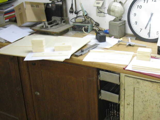 Cuando corte las piezas en mi mesa de la sierra y los agujeros del dedo de perforación con una broca de 25 mm en el taladro grande vino en práctico para imprimir los dibujos en el tamaño correcto. Así era muy fácil de controlar y ordenar las 71 piezas y cuerpos.