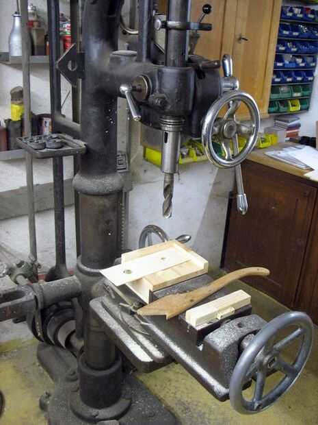 El doble fondo era el pedazo pasado pegado juntos, cuando el pecho se terminó y pude comprobar las mediciones una última vez. Para obtener las barras con la mezcla de la tarjeta en sus lugares perforar orificios de 6mm en las barras y la parte inferior y había conectado con la ayuda de dos espigas de 6mm. Para mantenerlos rectos mientras pegado utilicé mis plantillas de pedacito de taladro.