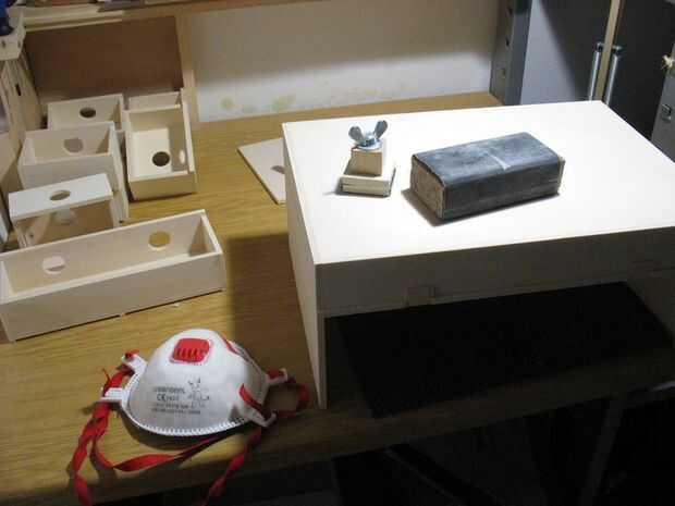 Antes del lijado final llevó algo de agua y una esponja húmeda todas las piezas de madera. Que hizo todas las fibras en posición vertical y pude arena les lejos. Teóricamente también se puede lijar después de aplicar la primera capa de aceite de linaza, pero cuando las piezas son de color sería muy útil cuando las superficies se conseguirían ásperas.