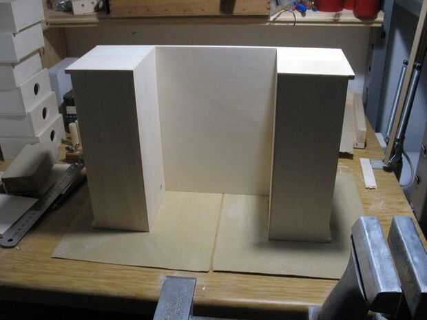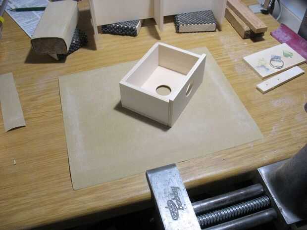 Después de pegar aplanó los lados colocando un papel de 80 sobre la mesa y mover las piezas sobre él. Trabajó con los cajones, pero para piezas más grandes fijado el papel de la arena en un tablero viejo para mantener en su lugar.