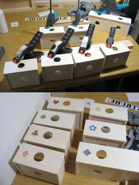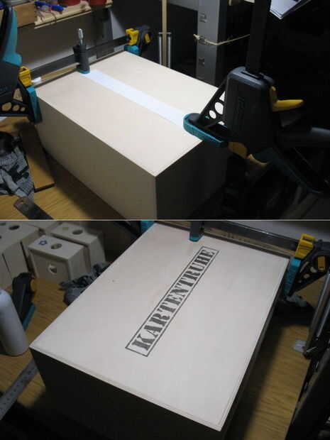 Primero imprimí las escrituras invertidas de espejo y con full color activada (no hay ahorro aquí) en mi impresora láser. Es útil para obtener suficiente borde alrededor de ellos, por ejemplo, hice las fronteras para los símbolos de la tarjeta que empareja a los frentes de cajón para colocarles era más fácil. Usé mi abrazaderas para fijar el papel sobre las superficies. Luego tomó una lata de aerosol con disolvente universal y un paño y rocía algún diluyente en el papel y presiona sobre la superficie con el paño. La fijación simple me permitió comprobar la transferencia sin salir de la posición del papel y que lo repita, cuando sea necesario.