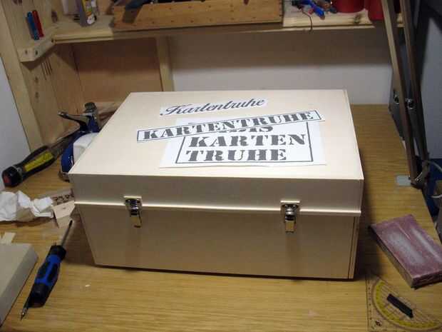 Me decidí a escribir el nombre del cumpleañero y "Kartentruhe" (literalmente "pecho de tarjeta") en el pecho. Para mejor visualización tomó algunas fuentes y les imprime y ponerlos directamente en el pecho. Decidí a favor del secreto para el "Kartentruhe" y aves del paraíso para la firma. Por fin tengo un lugar para mi logo personal debajo de la parte inferior doble.