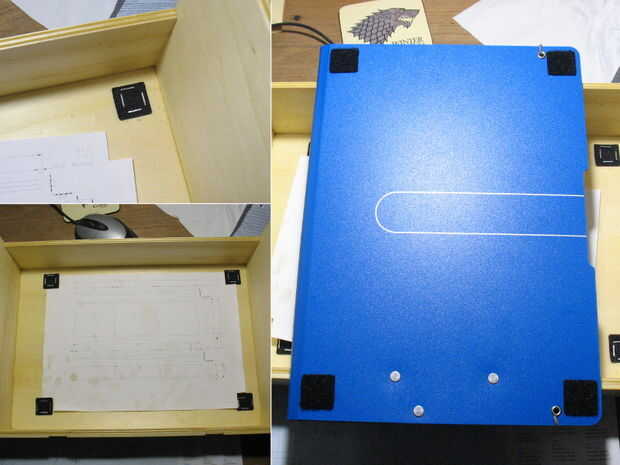 Luego vino el portapapeles. Tengo algunos velcro auto-adhesivo que os adjunto primero en el portapapeles. Primero traté de las contrapartes en el portapapeles, así y presiónelo en conjunto en la parte superior, pero esto no funciona en una superficie recién engrasada. Tomó una hoja de papel ayudar a posicionar las contrapartes y me tomó una grapadora para pegarlas.