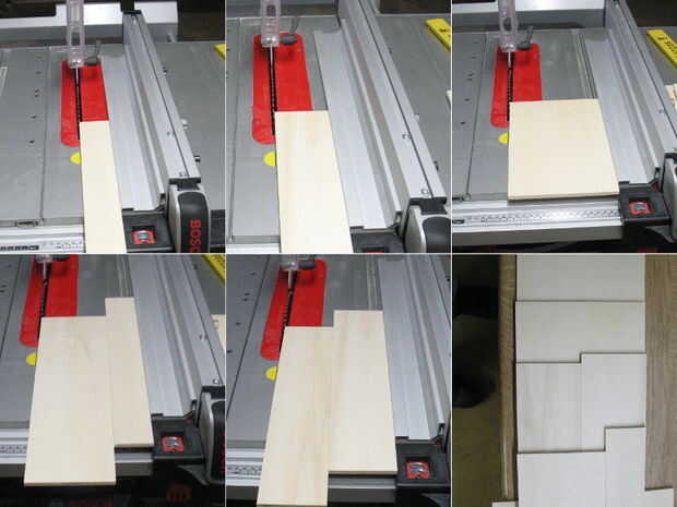 - Cuando se cortan las alturas del frente, piezas laterales y posteriores del tórax en su mesa vieron puede hacerlo así: primero se corta un pedazo de delantero, entonces una pieza posterior, entonces las piezas laterales. Estos últimos tienen la altura total de todos modos. Ahora puedes dejar la guía de la Sierra de mesa en su posición y cortar las partes restantes con las dos primeras partes como espaciador.
