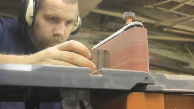 Una vez seco, el cubo se saque las abrazaderas y cada lado es de arena suave. En la parte superior forma un arco es dibujado para crear la forma del pecho de tesoro.