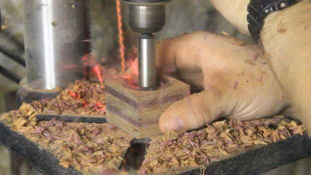 Mientras esto seca la izquierda sobre tripas de la caja tiene la parte superior cortada y un agujero perforado en el centro para sostener el anillo.