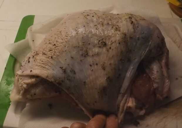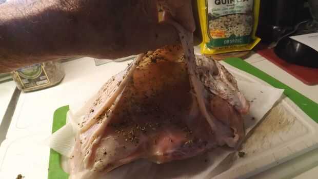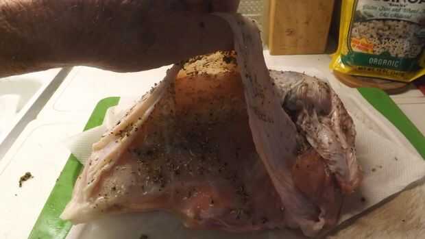 3. Frotar la mezcla sobre y debajo de la piel de la pechuga de pavo