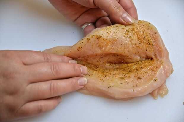 Cortar la pechuga de pollo para que el corte es en forma de un bolsillo.