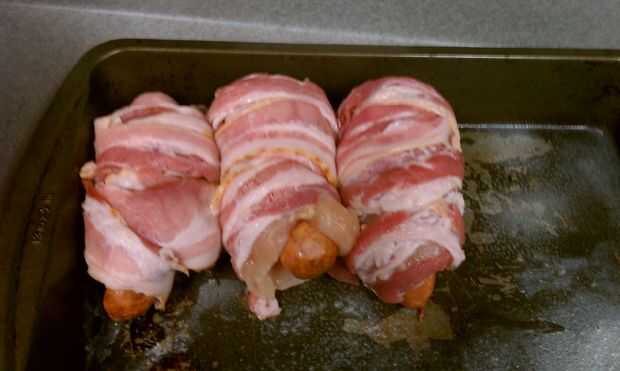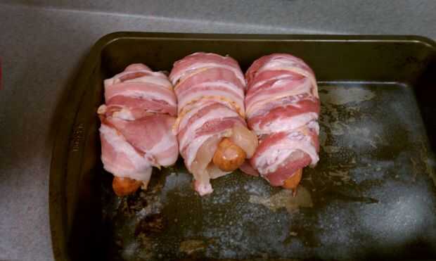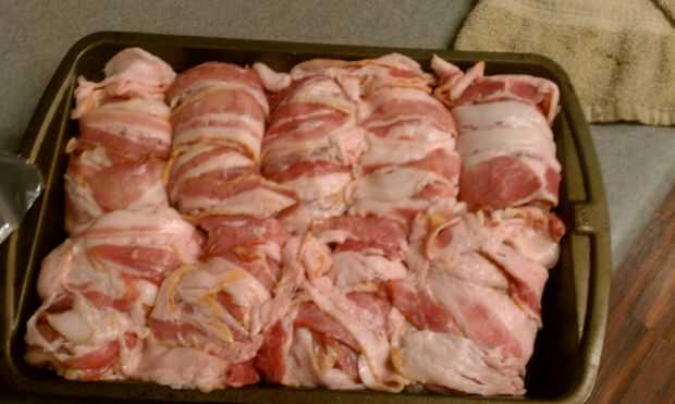 3. empezar a envolver la cosa entera en las rebanadas de tocino