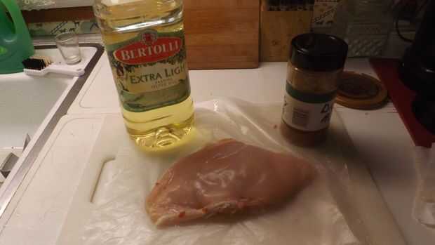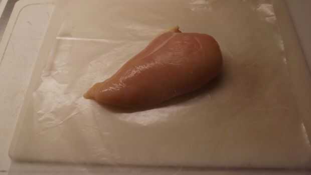 1. Una pechuga de pollo, sin hueso, piel, grasa elimina (en este caso, para una persona, 9 - 9-1/2 onzas)