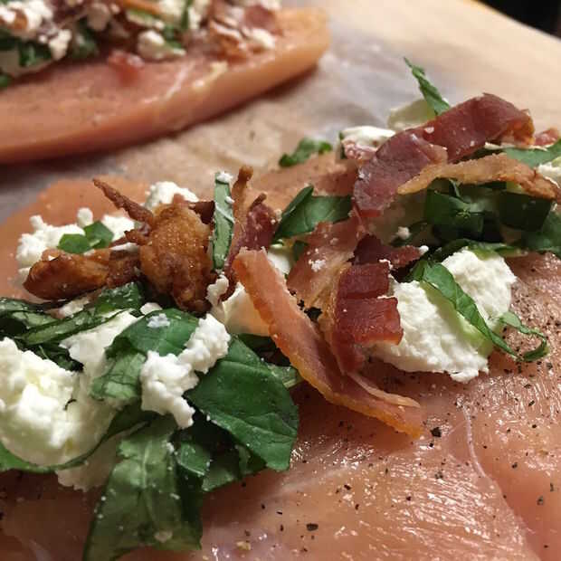 Abra el pecho para que ambas mitades pueden mentir planos. Temporada la superficie expuesta con sal y pimienta, luego agregar 1/4 de queso ricotta, desmenuzado tocino ahumado y en rodajas hojas de albahaca en cada mama.