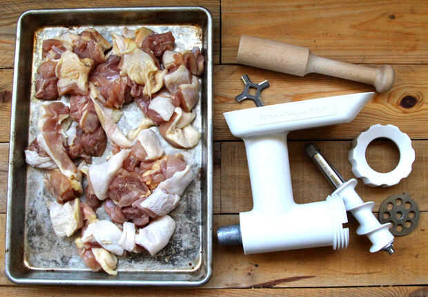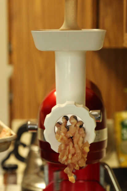 Tomar los muslos y corte en cuadrados de 1-2 pulgadas. Lugar la, carne en una bandeja y ponerlo en el congelador. También quieren poner sus piezas de molino de carne en allí también. No hago mucho de salchicha pero si lo hice yo conseguiría un molino dedicado. Por ahora, funciona bien la amoladora para mi batidora KitchenAid. Usé el dado 3/8". El accesorio viene con dos dados, es la más gruesa de las dos. Me gusta la textura que consigo usando el dado más grueso y para aves de corral creo que esto reduce el riesgo de sobrecargar de trabajo la carne y derrite la grasa como grasa avícola tiende a derretir en una temperatura más baja que el cerdo.