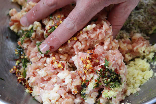 Ahora desea agregar la salsa de pescado y el agua fría y mezclar todo hasta que se combinan bien. No quieren que trabaje más la carne o el riesgo de las fallas mismo como si la carne consigue demasiado caliente pasando a través de la amoladora. Usé mis manos pero debo admitir que era casi doloroso frío! No dude en utilizar una cuchara!