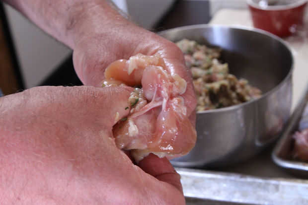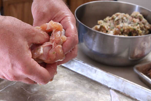 Ahora llena la salchicha es bastante fácil. Me gusta envolver suavemente mi mano en la parte superior de la abertura en el ala y con mi mano libre simplemente coloque la salchicha en la abertura, empuja hacia abajo en el cuerpo del ala. Desea tenerlos bastante completo pero no estalla. Me gustaría dejar un pequeño salchicha expuesto en la parte superior. La carne se contraerá cuando se cocina así que si las alas son mullidas corren el riesgo de rasgado y perder algo de zumo. Esto es sólo una palabra de precaución como lo que me sucedió en unos pocos y estaban todavía deliciosos!
