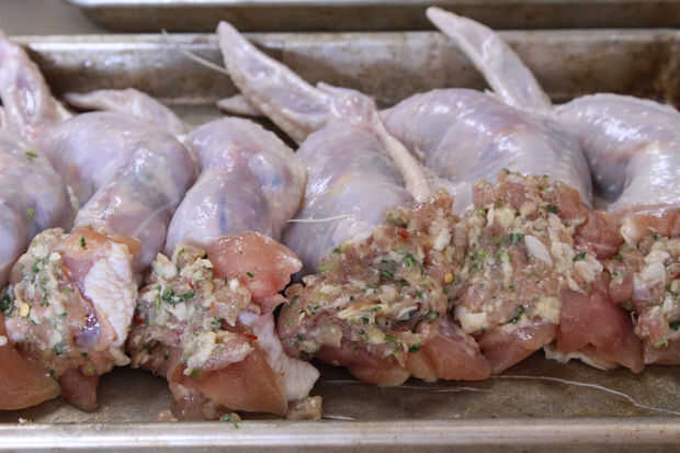 Ahora que el relleno está listo y las alas son marinadas es hora de poner los dos juntos. Tomar las alas de la nevera. En primer lugar, usted querrá interior al reves de lo que son ahora. Es el momento de obtener la carne en el interior y la piel en el exterior otra vez.