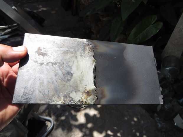 Para ello he utilizado una linterna y mucha paciencia. El calor de la antorcha hizo la pintura irrumpió en llamas con bastante humo tan una mascarilla y ventilación crutial. Las fotos muestran cómo se quema la pintura y se quita del metal con un soplete.