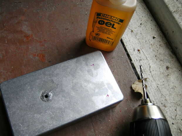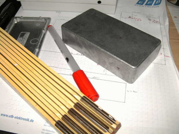 Marca en la caja (debido a ruido blindaje preferiblemente un metal uno) donde quieras que tu tomas, potis, LEDs e interruptores y taladrar los agujeros.