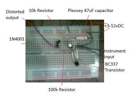 Edición: Si se aumenta la entrada capacito (el capacitor de 100n) las frecuencias más bajas pueden fluir a través del amplificador de emisor común, causando más del efecto distorsionado. Además, si cambias el bias del transistor (swap el 100 k resistencia de un valor mucho mayor, por ejemplo, 680k o más, el transistor se verá obligado a clip asimétrico, aumento de la distorsión. Ir a la última página para clips de sonido :)