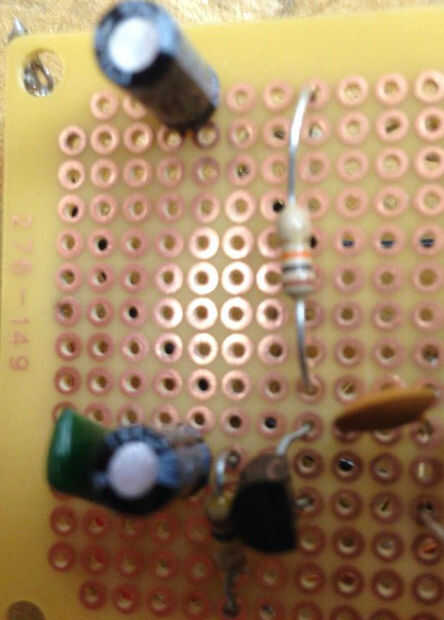 El siguiente paso consiste en un transistor, la resistencia de ohmio 10 k y el condensador de .1uF. En primer lugar, la media pata del transistor se engancha cruce de resistor de 100 k y el condensador de .01uF de la diapositiva anterior. La pierna derecha del transistor (emisor) va a tierra, mientras que la pierna izquierda se unirá a la resistencia de ohmio 10 k y el condensador de .1uF.