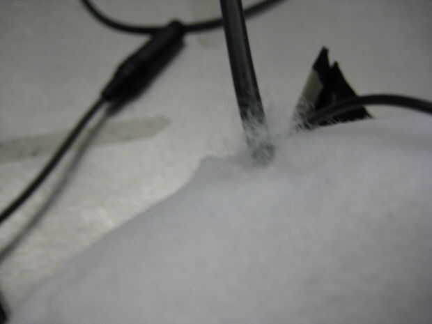 Dividir la bola en tercios (mentalmente) y cortar 1/2" cortes a intervalos de tercera alrededor de la base de la bola. Pase los cables a través de estos (teniendo cuidado de no enredarlos).