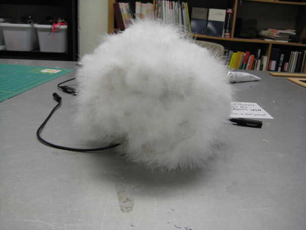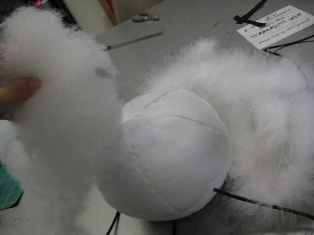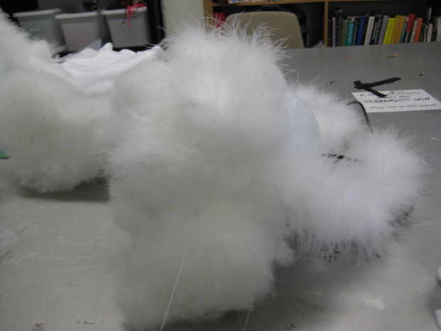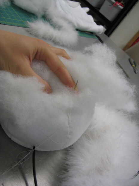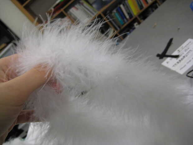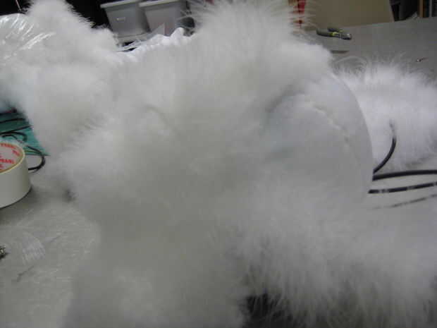 Now is time to add the fuzz. Te recomiendo insensiblemente coser en cantidad generosa de boas bateo y pluma blanca.