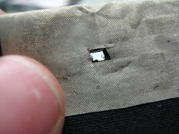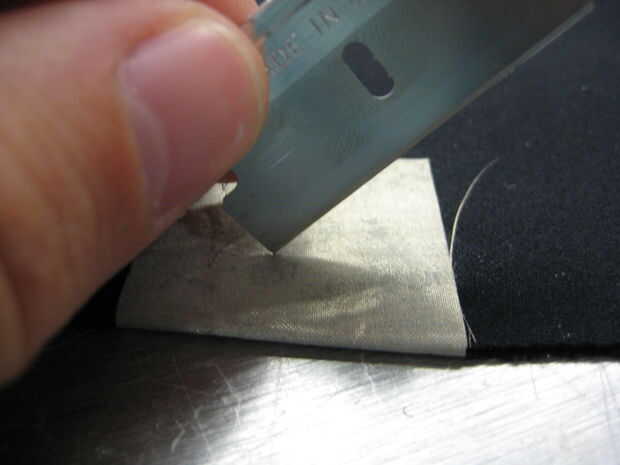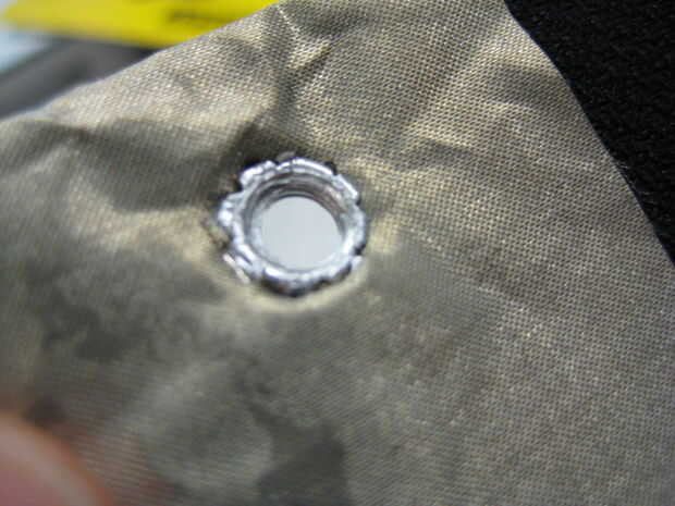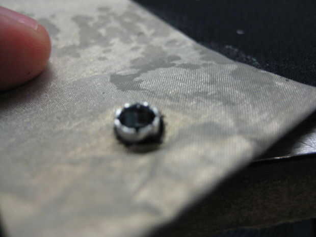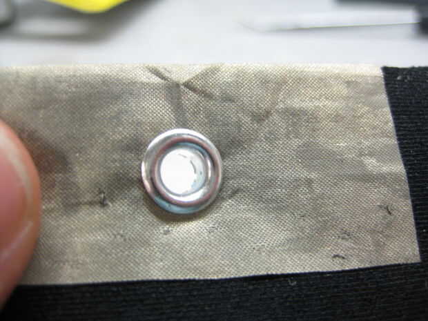 Con una navaja o cuchillo del exacto, corte un agujero ligeramente más pequeño que su ojete (en el centro de la pequeña lengüeta conductora pegado al exterior del interruptor). Inserte el ojal por el orificio y abrazadera de cierre con su herramienta de ojete.