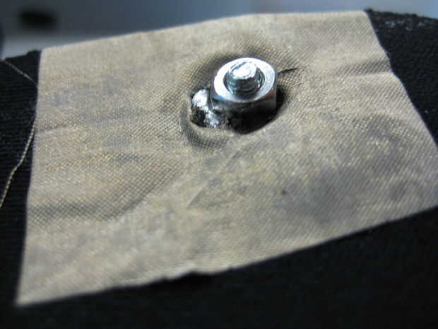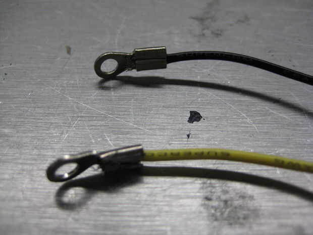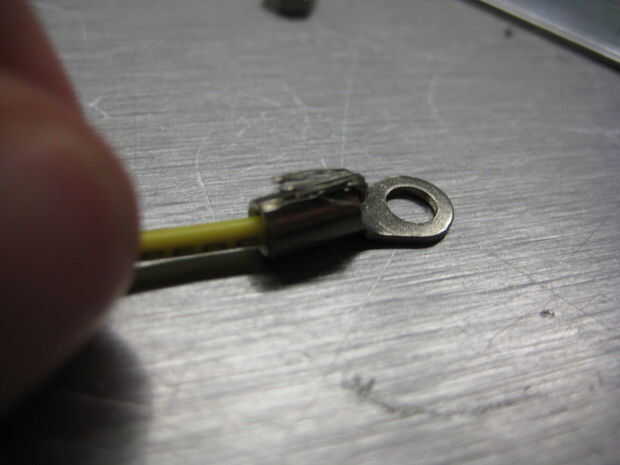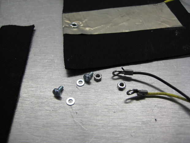 Fije los cables a cada uno de los ojales de tal manera que el pero (y lavadora) se enfrentan en (el lado con la mayor superficie conductora) y el tornillo se inserta a través de la parte exterior (el lado con la pequeña lengüeta conductora).