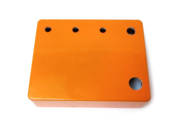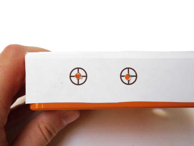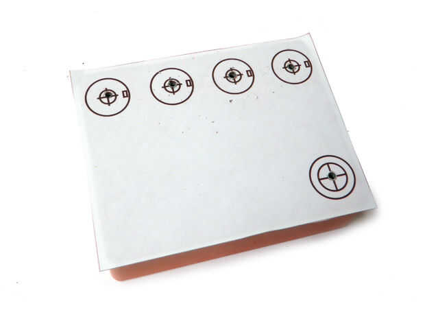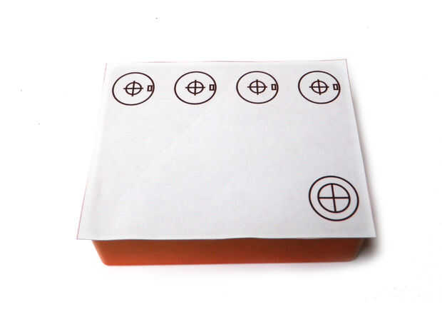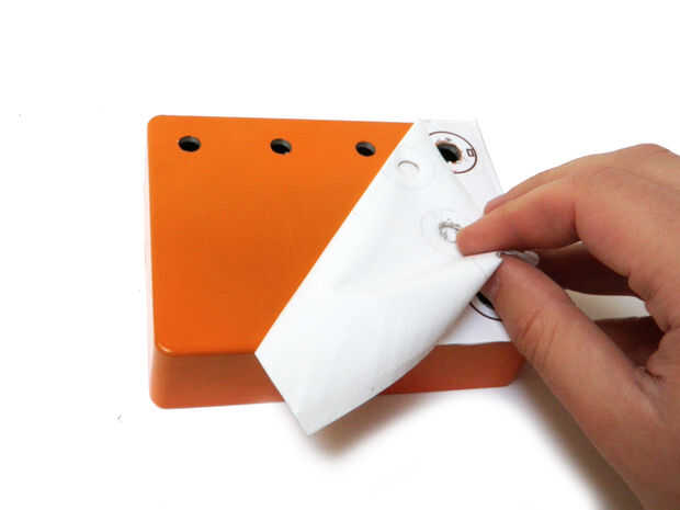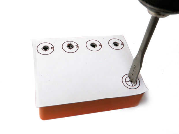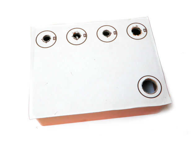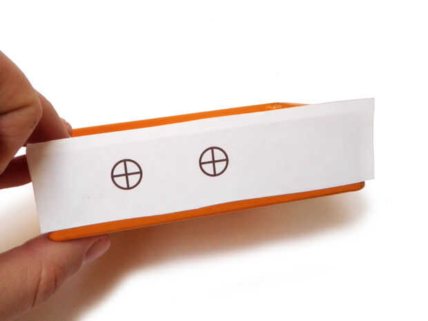 A continuación, pegue la siguiente plantilla adhesiva para el borde posterior. En otras palabras, pegarla a la cara de borde más estrechamente contigua a los agujeros del potenciómetro.