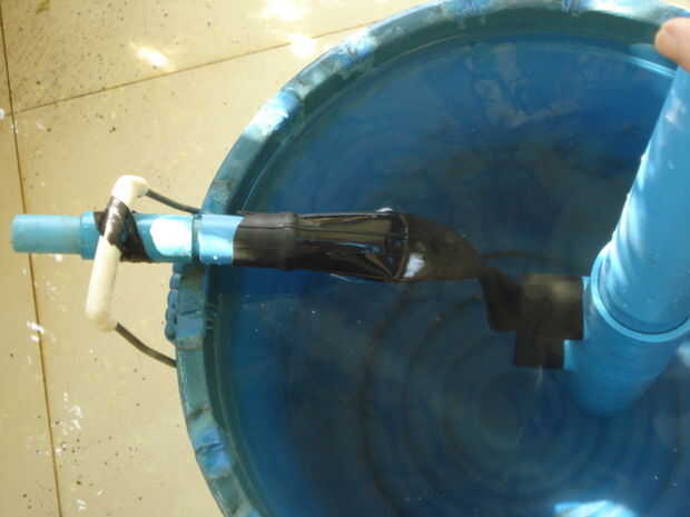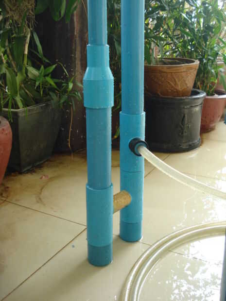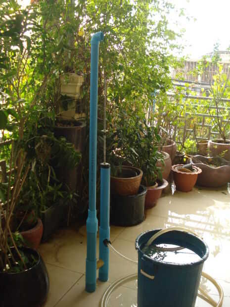 El siguiente paso es incluir el tubo de salida dentro de un tubo de gran diámetro para que el agua bombeada puede proporcionar la presión necesaria para cerrar la válvula del tubo interno y para un tubo de alimentación a la entrada de la bomba. Esto eliminaría la necesidad de la bomba que se sumerge.