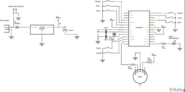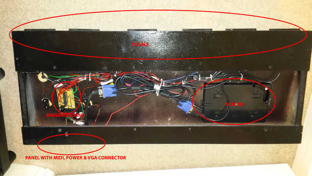 Usted podría hacer esto de muchas maneras y si desea utilizar un Arduino pero no quieren hacer la soldadura le podría conseguir un Arduino Nano, micro Arduino, Arduino Uno, teensy o cualquier otro dispositivo compatible de IDE de Arduino. Descargar el pde y subirlo a su tablero y virutas (un montón de guías en esta función lo que usas) y conectar cada pedal y el LED, la toma MIDI, un conector VGA, una toma de corriente.