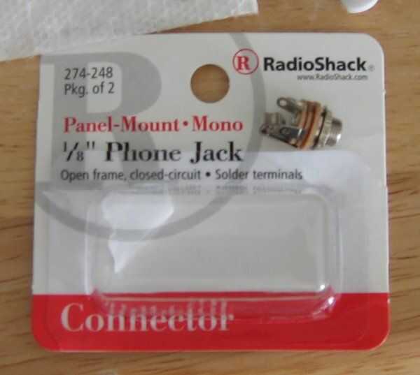 Usted también tendrá un viaje rápido a radio shack para un conector de teléfono de 1/8" se muestra a continuación. Llevan estos en la parte trasera de la tienda en las bandejas extraíbles de poco repuestos. Usted encontrará éstos en conectores de audio. $3, encontrará dos.