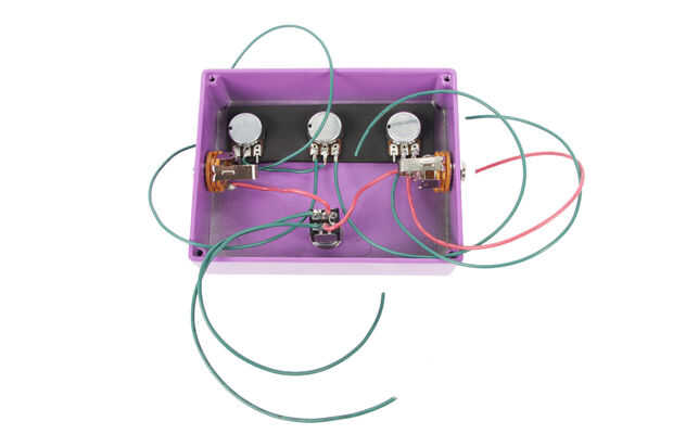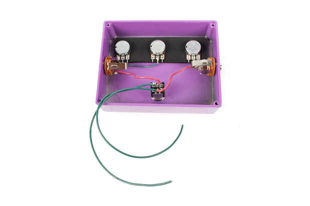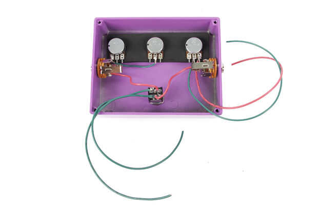 Conecte un cable de 4" de verde a la ficha de centro del potenciómetro lineal de 100K y un alambre de 4" de rojo a la pestaña de la derecha.