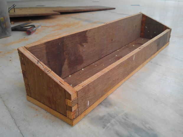 Clavar la pieza base inferior al resto de los artilugios y presentado de que sobresale de los bordes de las articulaciones de la caja, y pegué las juntas con pegamento de madera. Tenía algún material laminado a la izquierda, para cortar pieza de él y pegado a la superficie externa para que se vea bonito!