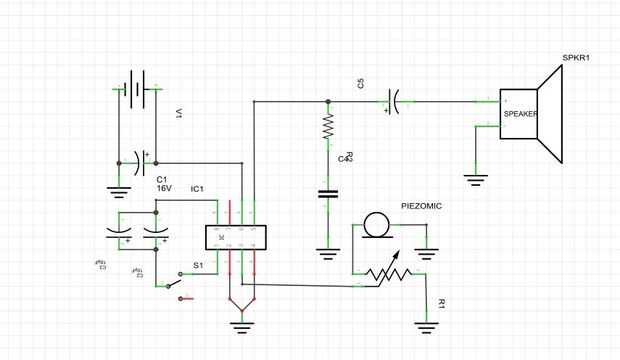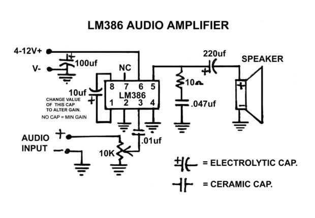 Este es el circuito Original para que se hace referencia. Lo único que modifico es que añadir que otro 10 uf en paralelo con otro condensador de 10uf y en serie con un interruptor conectado todo paralelo a los pines 1 y 8 de lo Op-Amp.