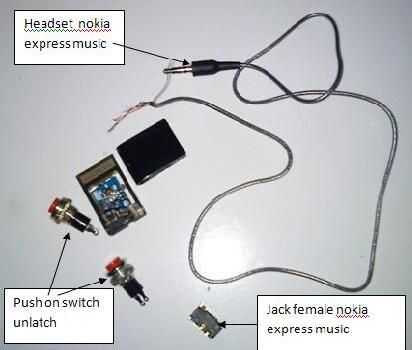 herramientas: soldadura de la lata n, guting, cortador, destornillador +, etc.. materiales: nokia express music mujer gato 3,6 mm., auricular nokia express music, empujar-en conmutador para cierre de caja/caja de 2 piezas, anda, como se muestra a continuación