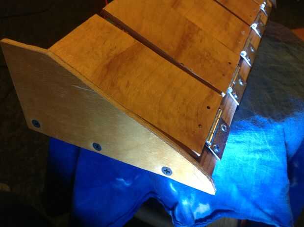 Los lados se unen con tornillos de madera corta. Los tornillos stock que viene con las bisagras eran un poco demasiado largos y quería empujar a través de los pedales finos, usé mucho tornillos más cortos que tenía en el cajón de basura, enriquecida con un poco de pegamento.