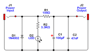 Potencia de entrada se suministra al conector J1, directamente desde la salida de nuestra fuente de energía del pedal. Diodo D1 - protege contra inversión de polaridad. R2 - limita la corriente que fluye hacia el LED D2. Si el LED no es necesario - quitar y R2, también. Se dedica a la reducción de ruido en los condensadores C1 y C2, resistor R1.