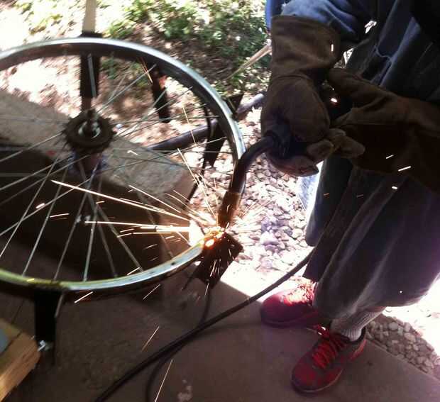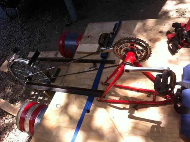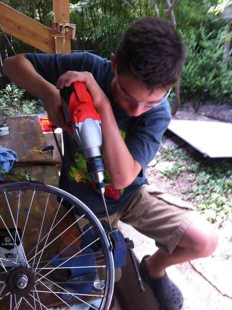 Revisamos el diseño de la rueda un poco por un tornillo de 6" en el eje para extender y darnos más espacio para las paletas de la soldadura. A continuación cortamos hasta el marco de la cama en 5" piezas soportes de remo, y dos longitudes de 30" para ser el marco para la rueda de corte. Después de soldadura la paleta admite en su lugar y algunos agujeros, lo ponemos todo junto.