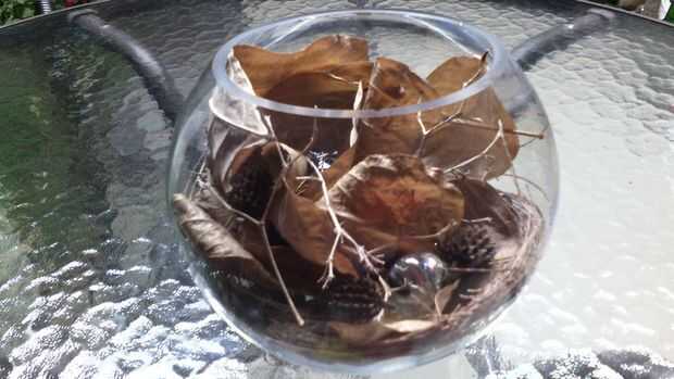 Colocar las ramitas entre los amplios espacios de las hojas y luego poner los granos de cristal cerca del borde de la parte interior del vidrio pero fuera de las hojas (no en la parte superior). Luego usar las semillas de cono de pino (o su elección) y granos de café para llenar aún más en los espacios más pequeños.