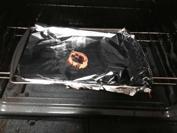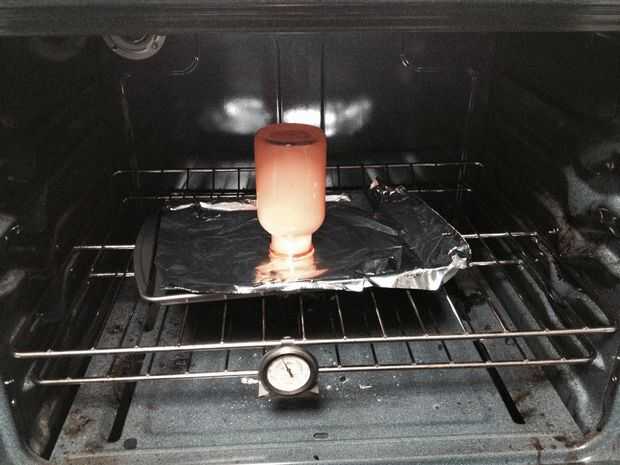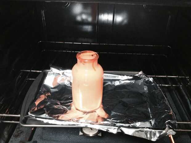Sacar del horno. Colocar una pieza nueva de papel de aluminio sobre la parte icky y levante la parte de abajo de tarro y deje hornear durante 30-60 minutos dependiendo del tamaño de tu frasco.
