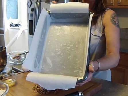 Precalentar el horno a 350. Una bandeja para hornear de 9 x 13 con papel pergamino, papel dejando tiempo suficiente para sacar blondies de pan cuando se hace la línea. Rasgar una hoja más larga que mi pan y me cortan cuadrados en cada esquina para que encaje perfectamente en la bandeja. Engrase ligeramente el pergamino, utilizo mis envolturas de mantequilla para este trabajo.