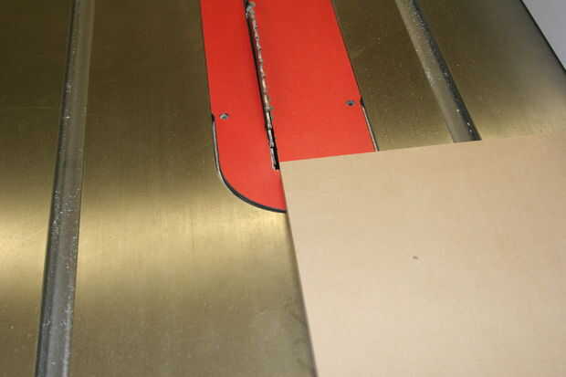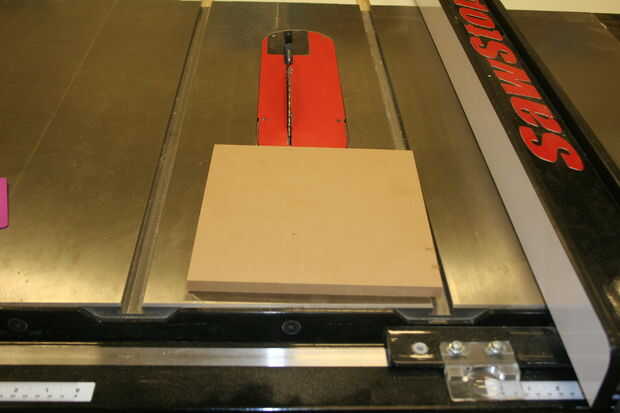 Rasgar abajo la última pieza de MDF para la parte superior del pedestal, la parte superior del pedestal desea la Junta ser cerveza de 1/8 en los cuatro lados. Desde el movimiento de la Sierra de mesa la fance sobre a 9 1/4 y rasgar abajo el MDF. Medidas a 9 1/4, hacen su último corte en la chuleta de sierra.