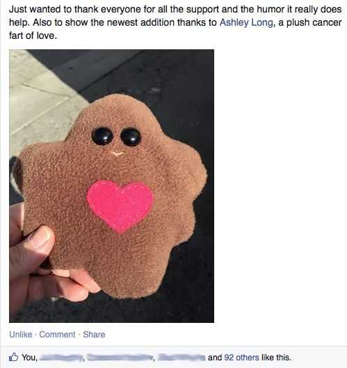 El regalo fue bien recibido por mi amigo... y toneladas de sus amigos FB, al parecer. Puede parecer un simple peluche, pero ofrece un triple ataque contra su enfermedad. Ahora tendrás algo que apriete una pelota de estrés cuando las cosas se ponen ásperas, algo agradable olor cuando él se siente náuseas y algo que mirar y reir y saber que tiene amigos que realmente se preocupan!