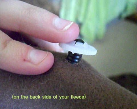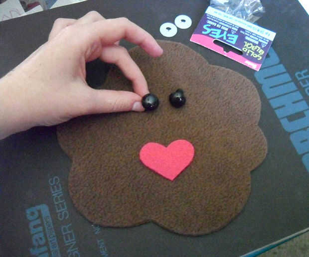 Coge los 2 ojos de plástico de seguridad y empezar a moverse en la forma de su cuerpo. Coloque todas las piezas y decidir a qué extremo de su nube de pedo te gusta para la "cabeza". Mover los ojos más separados, o arriba y abajo. Diversos arreglos se evocan una personalidad diferente para su nube, así que jugar hasta que tenga una configuración que le divierte. Recuerde mantener todo fuera de sus bordes. Me ha gustado mi mejor cuando el ojitos estaban juntos y fue centrado en el corazón derecho donde sería el pecho.
