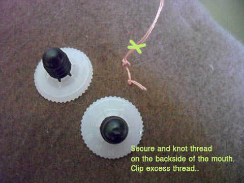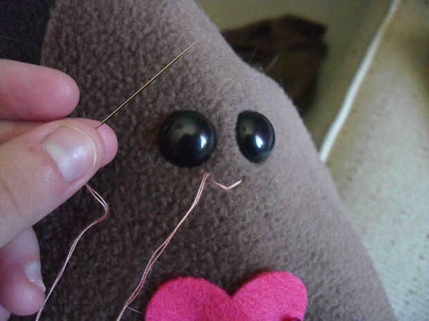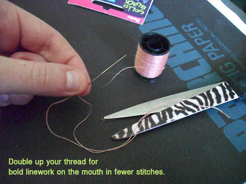 Por debajo de los ojos, la puntada simple pequeña forma de V. Comienzo de la parte de atrás para ocultar el nudo en el extremo de su hilo de. Sólo debían ir sobre cada lado de la V dos veces antes de que yo estaba contento con la claridad de la forma.