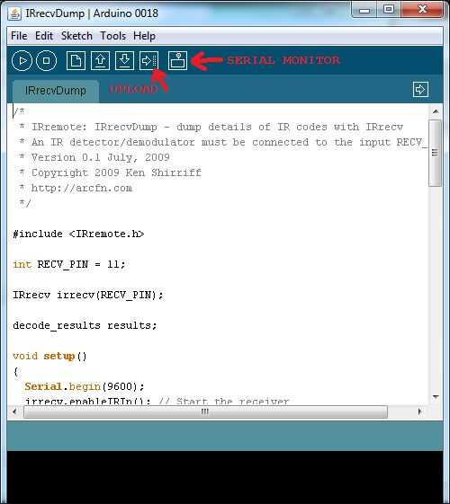 Se trata de biblioteca infrarrojo de Ken Shirriff que es capaz de grabar y la visualización de códigos de pulso crudo. Ya que proporciona códigos raws en lugar de sólo protocolos de empresa específico debería funcionar con cualquier control remoto envíos pulsos de IR.
