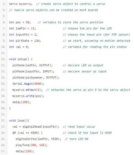 El código necesario para que el servo a trabajar cuando se detecta movimiento está disponible en este enlace.