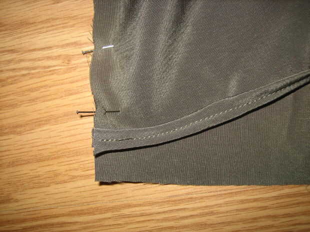 Pin la blusa a la falda, la cintura a la cintura. Cuando prender la cintura a la falda tendrá una 1 pulgada extra de tela que se utilizará como un margen más adelante. Distribuir uniformemente la tela cuando fijando dejando 1/2 pulgada de la tela de la falda en cada lado.  Coser la costura con un margen de costura de 3/4 de pulgada.