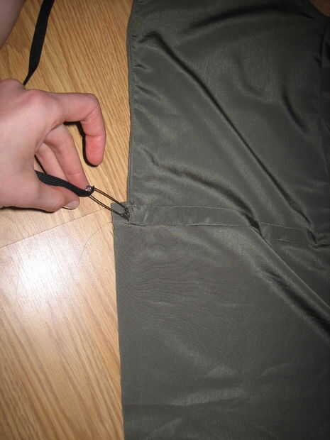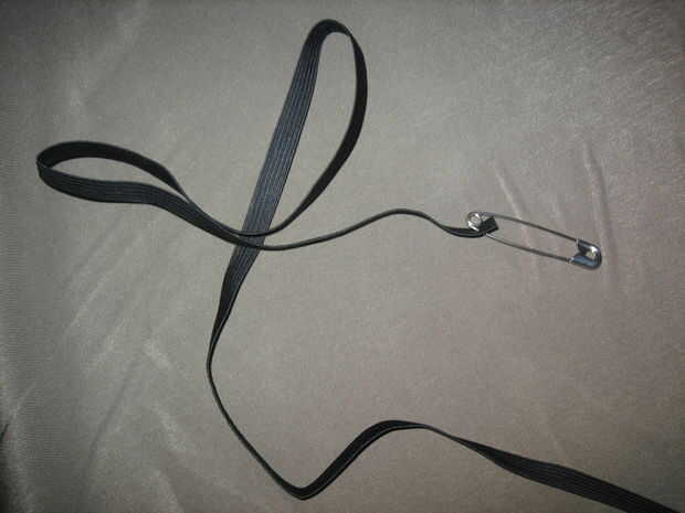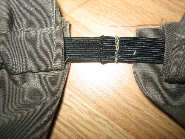 Medir y recortar su elástica que deseada se ajuste alrededor de la cintura (el mío era 28"). Conecte un extremo de su elástica a un imperdible grande y pase por la carcasa de la pretina. Una vez que se tira a través de la carcasa coser ambos extremos del elástico junto con unas puntadas y pespuntes.