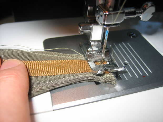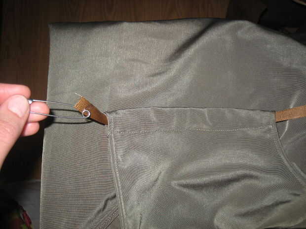 Coser un pedazo de cinta del grosgrain (cerca de 1 yarda de largo) para cada una de las correas, asegurándose de que se cose firmemente. Conecte el otro extremo de la cinta para el perno de seguridad y alimentación a través de la carcasa del escote de espalda en el lado correspondiente. Amarre las cintas juntas en un arco y recortar la cinta si es necesario.